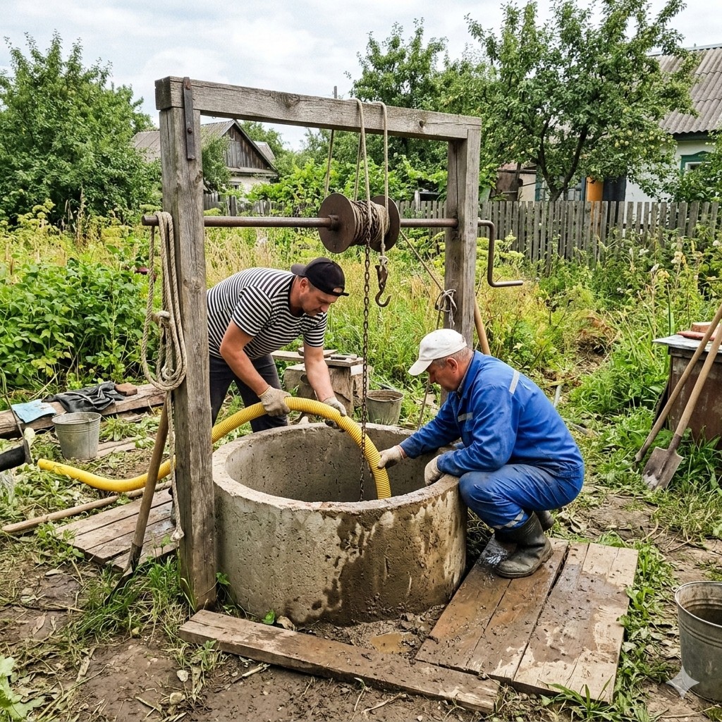 Чистка колодца весной — ежегодная процедура. Эти ребята делают её быстро и недорого.